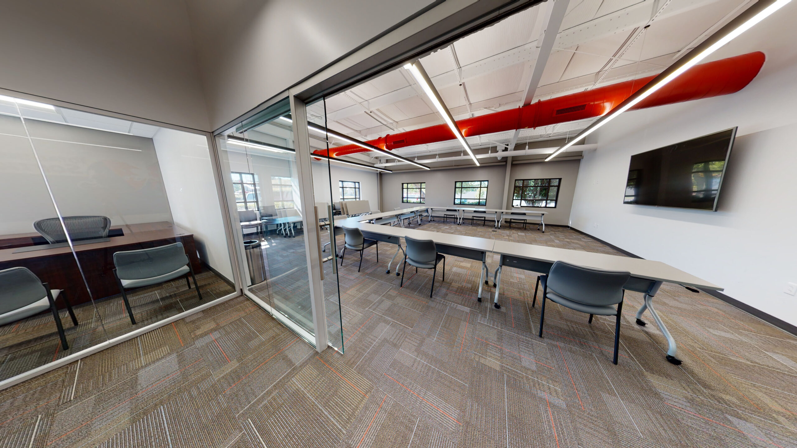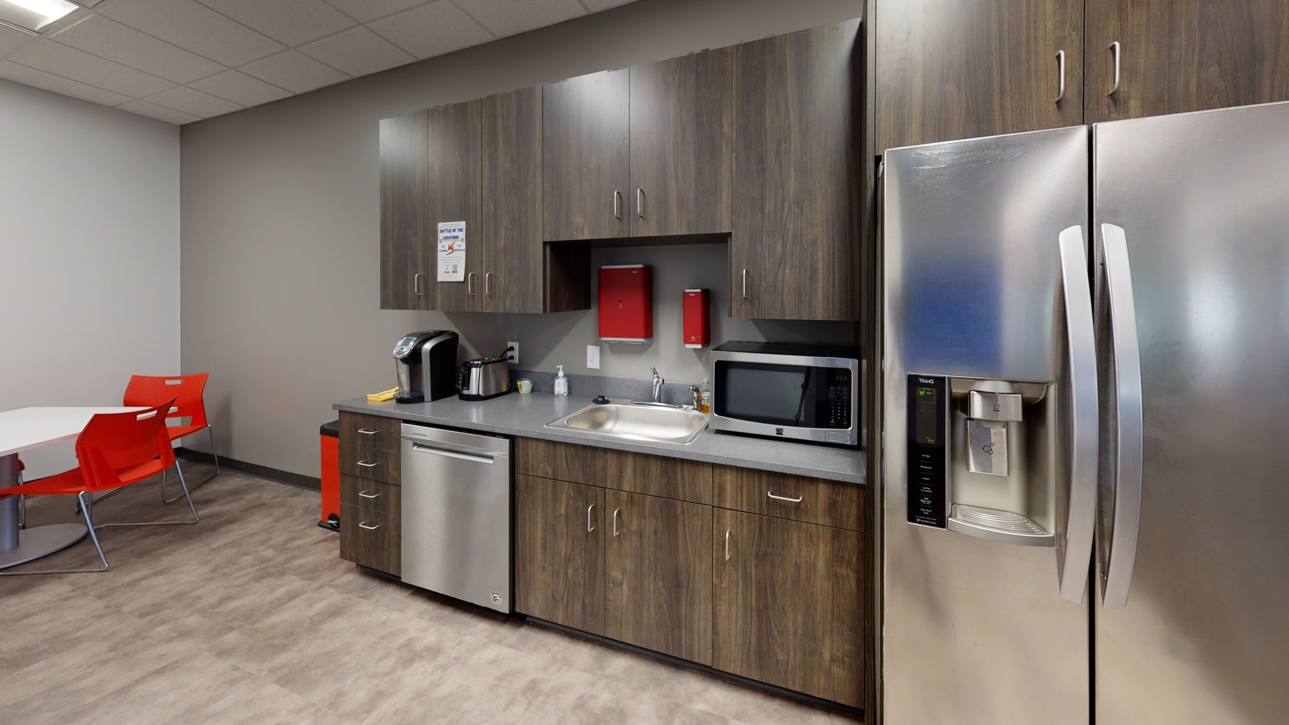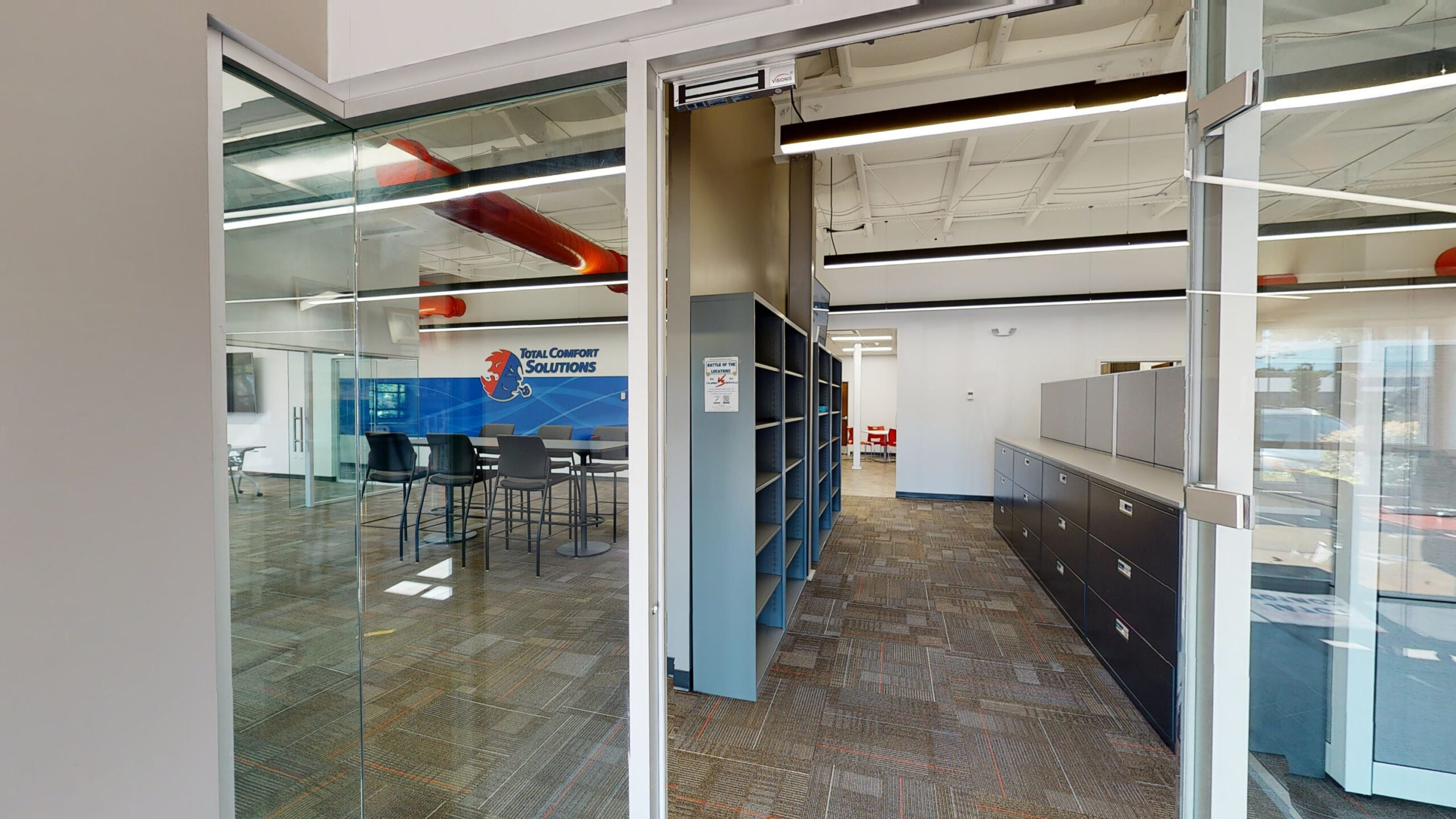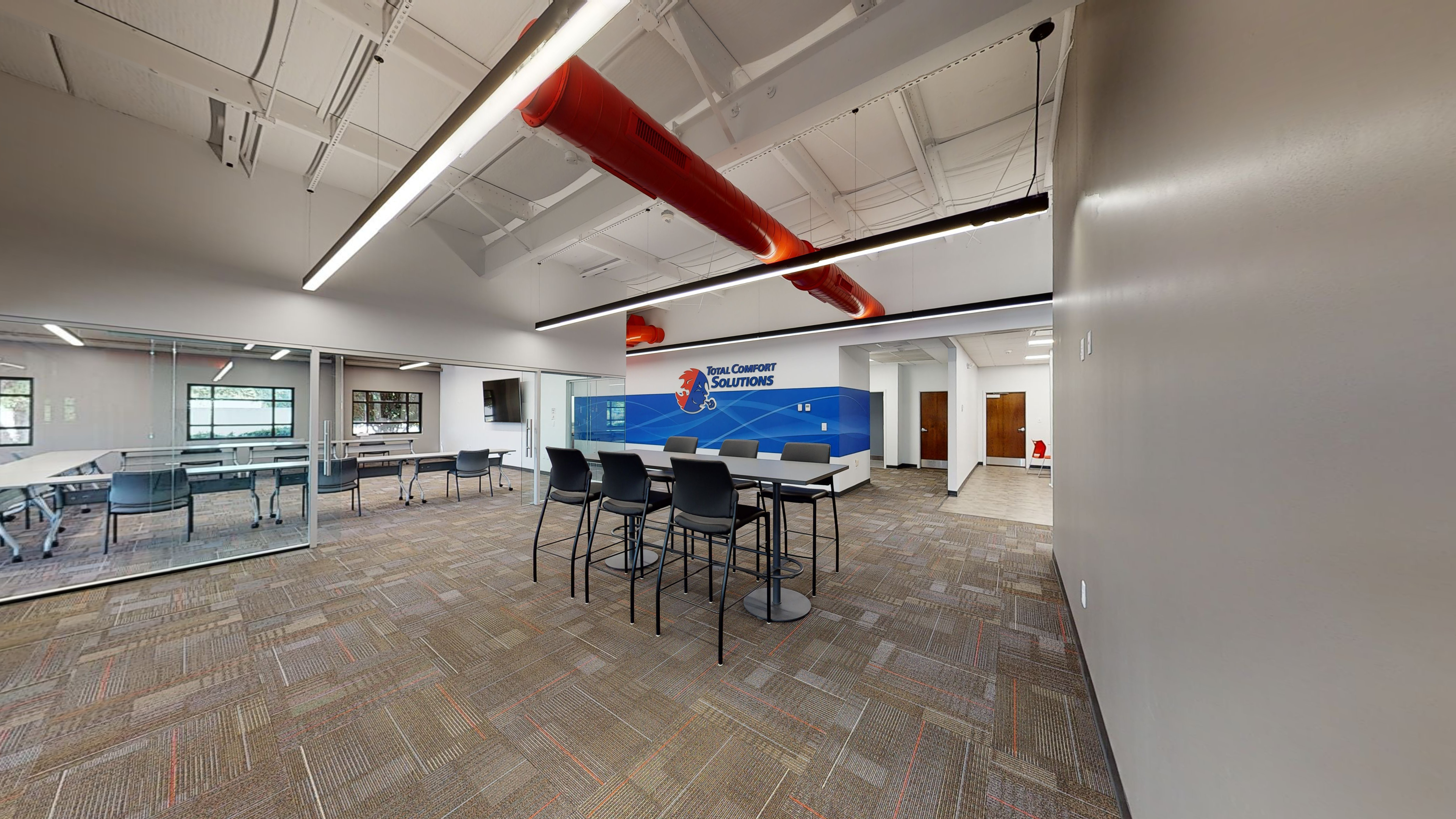 Total Comfort Solutions is a provider of commercial Heating, Ventilation, and Air Conditioning (HVAC) services, dedicated to meeting the unique needs of businesses. F3 worked on the Greenville location initially to set the standards for the interiors and ensure the space authentically reflected TCS’s brand identity. Leveraging the company’s signature bright red and energetic blue, F3 integrated these colors cohesively throughout the environment, from the carpet that features blue and red streaks to bold red air ducts in the open ceiling, which not only reinforced the brand but also highlighted TCS’s core business of HVAC. The furniture was selected to complement the brand palette and support the functionality of each area, with playful touches such as red paper towel holders and dispensers in the breakroom contributing to a unified look across the office.